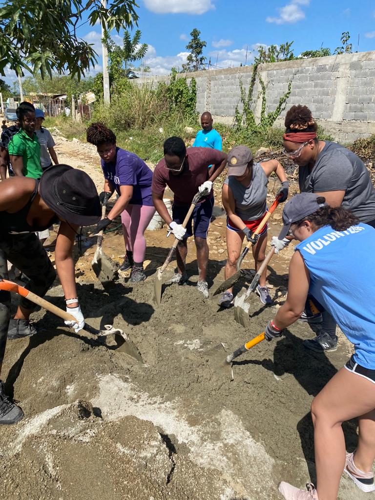 Rush students work together with Villa Verde, Dominican Republic, community members to mix and lay cement on the floor of five local homes in a flood prone area. Studies show replacing dirt floors with cement improves physical health, cognitive function, and mental well-being.