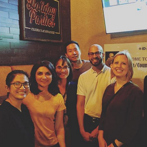Six third year fellows wear casual clothes and stand inside at a social gathering. The sign on the brick wall behind them reads "Holiday Parties".