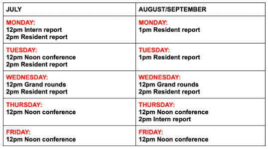 Noon Conference: This conference takes place on Thursdays and Fridays and is led by an Attending Physician or Fellow Physician, covering both interesting topics in medicine as well as issues that are often under-represented in medicine, such as health inequity, resident finances, artificial intelligence, and more.