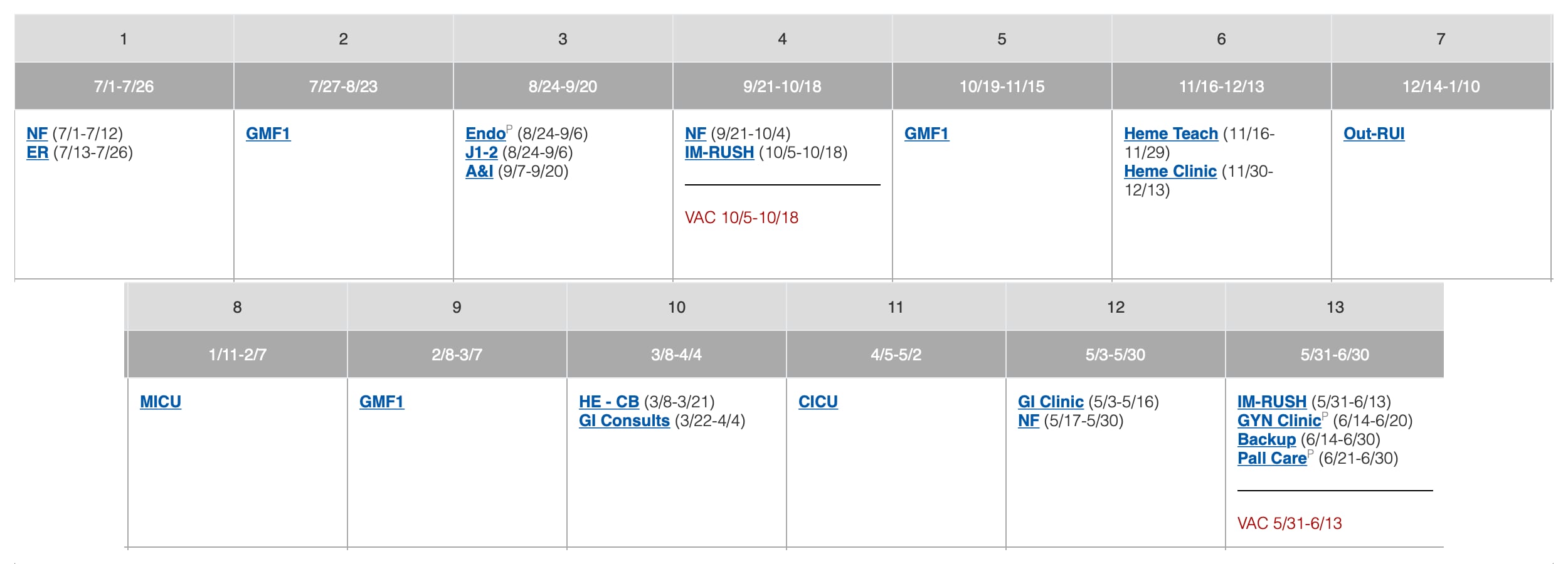 The image to the right is an example of a hypothetical PGY-3 schedule.