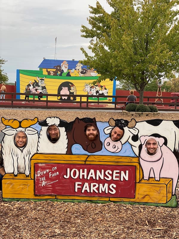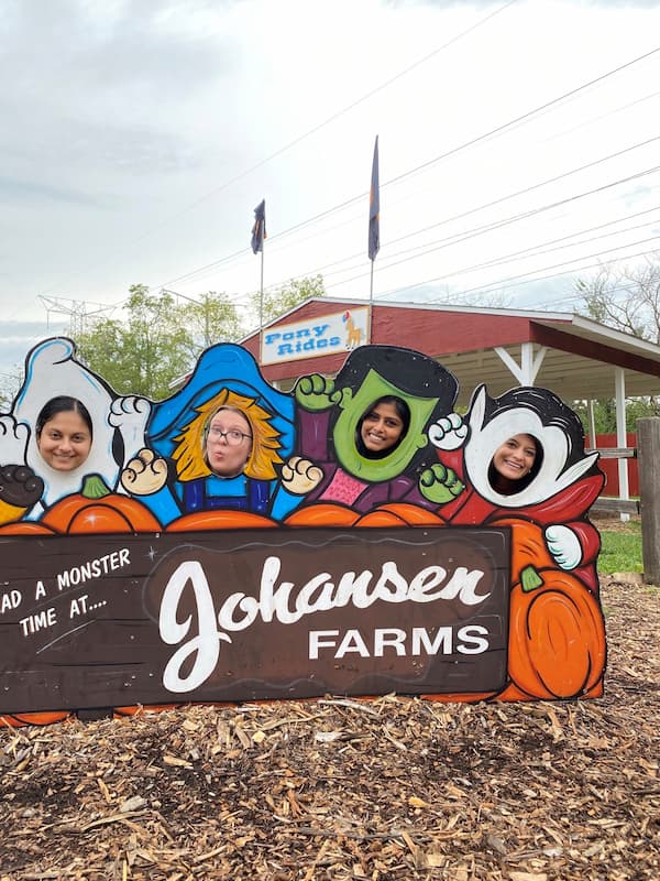 • Four people posing with their heads through cutouts featuring Halloween characters