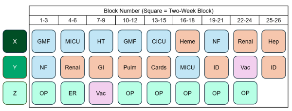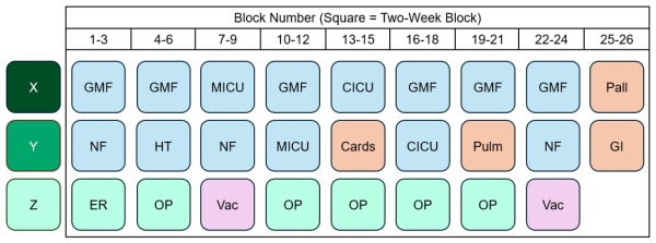 The image to the right is an example of a hypothetical PGY-3 schedule.