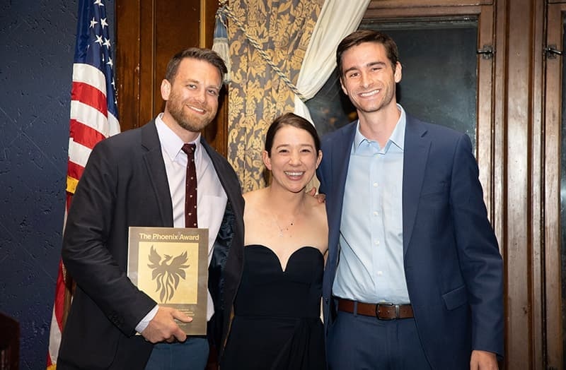 In the photo: Benjamin Veenstra, MD (left), received the Phoenix Award and the Leonard Tow Humanism in Medicine Award at the annual Commencement Banquet in April. The awards were presented by Class of 2019 graduates Mallory Davis and Harrison Pidgeon (right).