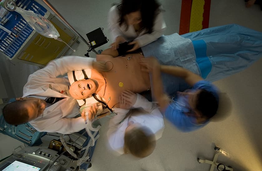 The center deploys, as appropriate, live actors to allow students to practice diagnosing, interacting with patients and family members, communicating with other professionals, and even what to do if a patient's condition deteriorates rapidly. Mannikins emulate heart sounds, pulses, breath sounds, and other bodily functions and may be used for training in invasive procedures like ventilation and defibrillation. Skill trainers and cadaver parts are available to teach central-line placement, emergency surgical airway access and for arthroscopic surgery simulation.