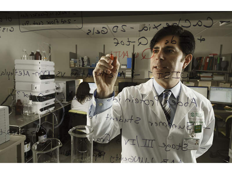 Jeffrey A. Borgia, PhD, is a graduate of the Biochemistry Graduate program at the University of Minnesota where he performed research in the field of proteoglycan biosynthesis in the laboratory of Dr. Theodore R. Oegema, Jr. During his post-doctoral studies, he collaborated with Dr. Gregg B. Fields where he explored the production of matrix metalloproteinases by melanoma cells when adhered to synthetic ‘mini-collagens’ as well as tumor cell aggressiveness. In 2002, Dr. Borgia joined the faculty at Rush in the Department of Biochemistry and launched his program focused on cancer biology and the development of novel diagnostic tests with Dr. John S. Coon, IV in the Department of Pathology. He is currently continuing these studies with appointments in both the Department of Anatomy & Cell Biology and Department of Pathology.