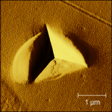 Above: SPM imaging was performed on a TI64 sample following indentation using a Berkovich pyramid tip. On the left, the topography of an area including an indent is visualized, whereas in the right image, the gradient (force) is shown.