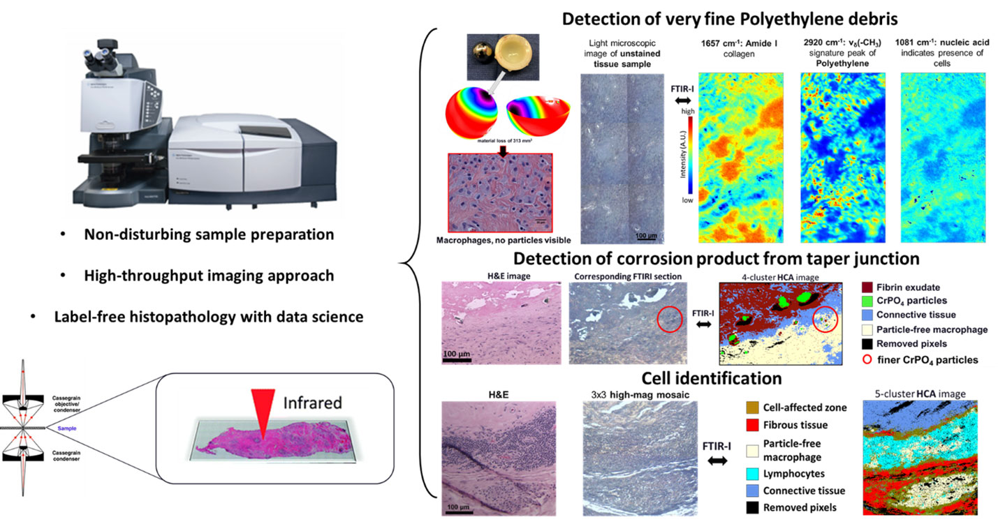 Fourier Transform Infrared (FTIR) imaging is a well-established analytical method for obtaining spectral and spatial information simultaneously in the micron-size domain. It provides molecular information based on vibrations of present functional groups, which provide a ‘fingerprint’ to identify tissue constituents and underlying biochemical alterations. This approach adds additional chemical information that allows the augmented histopathological analysis for better understanding the implant pathology. Our group is equipped with the Agilent Cary 620 FTIR microscope was coupled to an Agilent Cary 670 FTIR spectrometer (located in the Tribology Lab). It features a large liquid nitrogen cooled MCT focal-plane-array (FPA) detector with 128×128 pixels to image a FOV of 700×700 µm while maintaining the pixel size at 5.5×5.5 µm2 with the standard 15x objective. A high magnification mode with a x5 addition is available within the microscope, which provides a projected pixel size down to 1.1×1.1 µm2. Tissue samples are prepared following conventional histology practice except for using IR transparent slides (usually BaF2, or CaF2) as substrates. The illustration below highlights some of the work from our group.