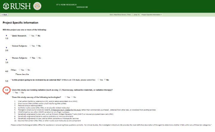 Answering Yes to question 6.0 – "Does this study use ionizing radiation (such as X-ray, CT, fluoroscopy, radioactive materials, or radiation therapy)?" – will open the Radiation Safety module for completion and activate the Create Radiation Safety button in your left task bar.
