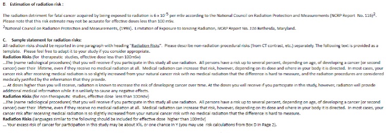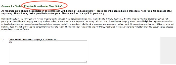 The various standard types of RSC-recommended radiation-risk language to include in informed consents for studies using ionizing radiation (differing in dose or physiological effect from the standard of care for individuals not participating in the research) are given below. A guidance document on completing the RSC Smart Form in the portal follows the model consent language.