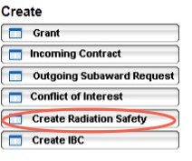 To create a new Radiation Safety application, click on the Create Radiation Safety button on the left task bar.