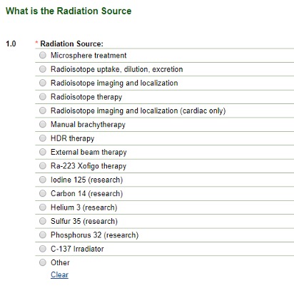 You may select more than one type. Based on your choices above, the application will branch out correspondingly. Choosing Brachytherapy, Diagnostic Radioisotope, External Beam Therapy or Therapeutic Radioisotope choices branch to reveal: