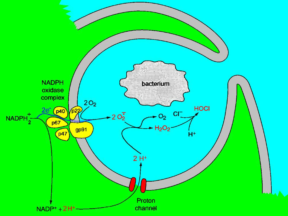 The lab measures the electron movement directly as an electrical current. For each electron, that leaves, one proton stays in the cell. To prevent massive depolarization as well as acidification, protons exit the cell through proton channels. Without H+ efflux, the killing process would be interrupted prematurely. Fortunately, proton channels are activated, relieving the cell of excess acid and preventing depolarization. The discovery of proton channels has been a great boon to cells that, until this time, had to use other, less efficient means of extruding acid