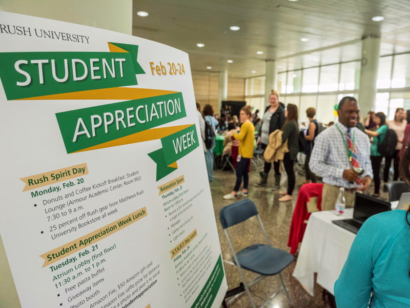 Each year the Office of Student Life & Engagement, along with Rush University faculty and staff, and the support of the Division of Student Affairs, celebrates all students at Rush University by hosting Student Appreciation Week. This celebration typically takes place during the spring semester and includes a variety of events to celebrate students and their contribution to and success at Rush University.