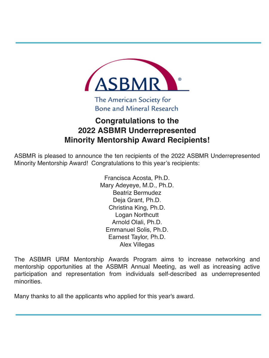 Arnold Olali, PhD, postdoctoral fellow in the Ross Lab, recently received one of the 2022 ASBMR Underrepresented Minority Mentorship Awards.