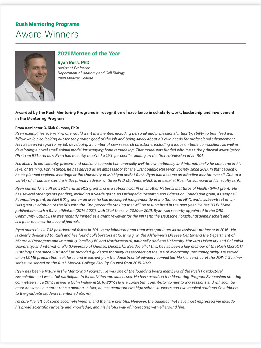 Congratulations to Ryan Ross, PhD, who was promoted to the rank of Associate Professor, effect July 1, 2022 in the Department of Anatomy & Cell Biology. Dr. Ross has conjoint appointments in the Department of Orthopaedic Surgery and the Department of Microbial Pathogens & Immunity. Dr. Ross received his BS in Chemical Engineering from the University of California at Riverside in 2006, with an emphasis in biochemistry and his PhD in Bioengineering from the University of Notre Dame in 2011. He joined the Sumner Lab as a post-doctoral fellow shortly after graduating and became an assistant professor in Anatomy & Cell Biology in 2016. Since becoming an assistant professor, Dr. Ross was appointed a RUSH University Cohn Fellow (2016-2017), was awarded an Orthoregeneration Network/Orthopaedic Research Society Education Grant Award (2018), was recognized by the RUSH Research Mentoring Program as the 2021 Mentee of the Year Award, was awarded a RUSH Catalyst Research grant in 2021, and was recognized in 2022 as the RUSH Graduate College Mentor of the Year. He is the principal investigator on four grants from the National Institutes of Health, including a K01 award, a R03 award, a R21 award and a R01 subaward. As if that were not enough, he has two R01 grants that will start in the next few months. Dr. Ross focuses on skeletal mineralization, biomarkers and why treatments for HIV negatively affect the skeleton. To date he is an author on 46 peer-reviewed, published manuscripts (23 as first or last author). He has been active in the two preeminent international research societies in his field, including the Orthopaedic Research Society and the American Society for Bone and Mineral Research. Three PhD students graduated from his lab this spring. Two have very impressive post-doctoral fellowships and the third has returned to medical school. We look forward to Ryan’s continued contributions to RUSH and the field of bone biology.Image