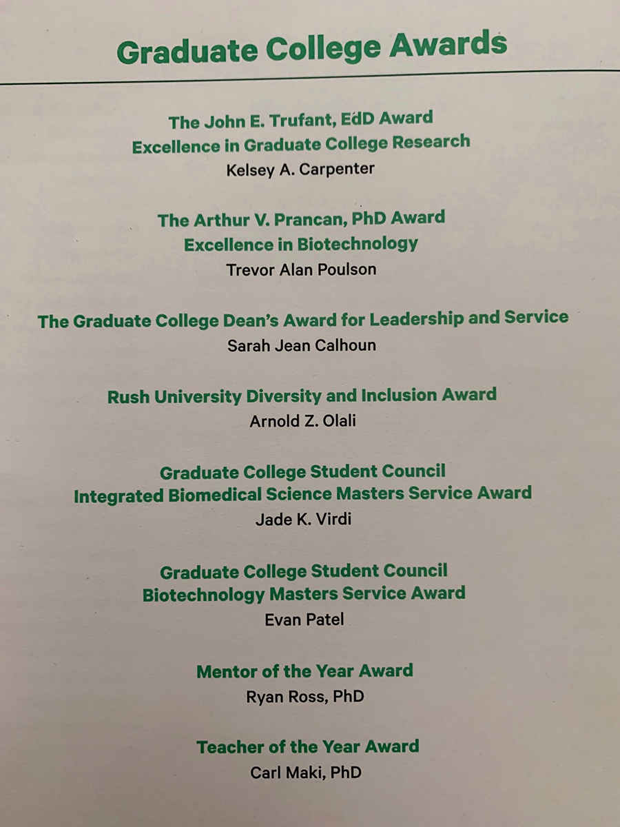 Each year, the Daniel Brainard Award is presented to a member of the faculty who has demonstrated outstanding ability, dedicated service, and teaching in the basic and behavioral sciences. This is one of four awards made by the graduating class to residents and faculty that have made a positive impact on their education experience at RUSH. The Brainard Award is one of the most prestigious honors that a RUSH Medical College faculty member can earn. Congratulations to our colleague, Dr. Wilson!Trainees News