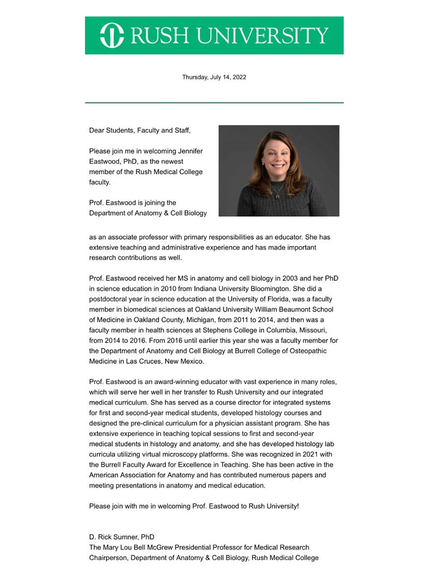 We would like to welcome Dr. Colleen Cheverko to the RUSH faculty. Dr. Cheverko is joining the Department of Anatomy & Cell Biology as an assistant professor with primary responsibilities as an educator. She is a great fit for this position because of her extensive teaching experience and her research which is focused on bone biology, a strength of the department. Dr. Cheverko earned her PhD at Ohio State University (2018) and did postdoctoral work at the University of California at Merced as a Chancellor’s Postdoctoral Fellow (2018-2020). She was recruited to Rush from the Edward Via College of Osteopathic Medicine in Louisiana, where she served as an assistant professor from 2021 to 2023. She has considerable experience in teaching anatomy and has received training and participated in numerous workshops on pedagogy and faculty development. She has already co-edited a book and has 7 peer reviewed articles and 4 book chapters, which is very productive for someone who has been at the rank of assistant professor since only 2021. Nationally, she has served on the Program Committee of the American Association of Biological Anthropologists, has served as a reviewer for the National Science Foundation, a manuscript reviewer for several journals and is a member of the American Association for Anatomy. At the institutions where she has trained or served as a faculty member, Dr. Cheverko has actively participated in multiple committees and roles. Please join with me in welcoming Dr. Cheverko to RUSH!Image