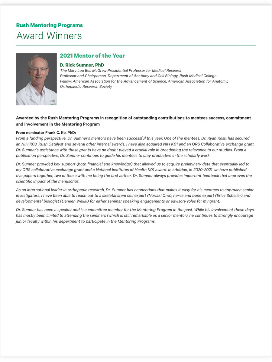 RUSH Stories: Rick Sumner, PhD, Named a 2021 Fellow of Orthopaedic Research Society. Read More.