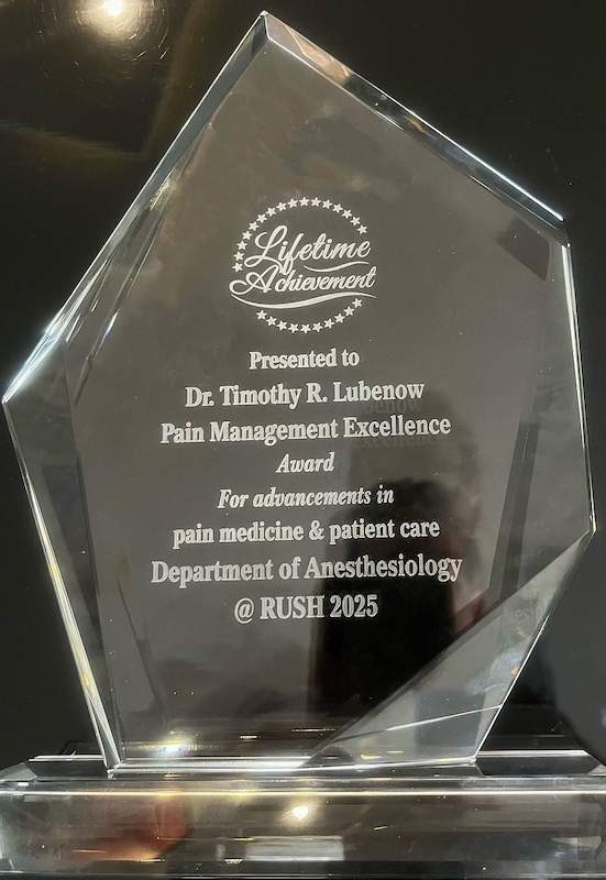 Dr. Timothy Lubenow, Professor, Rush Medical College, Director of Postoperative Analgesia Services, Director of Rush University Pain Center and Director of Pain Management, Rush University Medical center will be presented with a Lifetime Achievement award at the American Society of Pain and Neuroscience (ASPN) conference this summer at the awards symposium. The department of Anesthesiology here at Rush, is honored to have Dr. Lubenow part of the department for over 20 years and congratulate him on his most deserving lifetime achievement award.