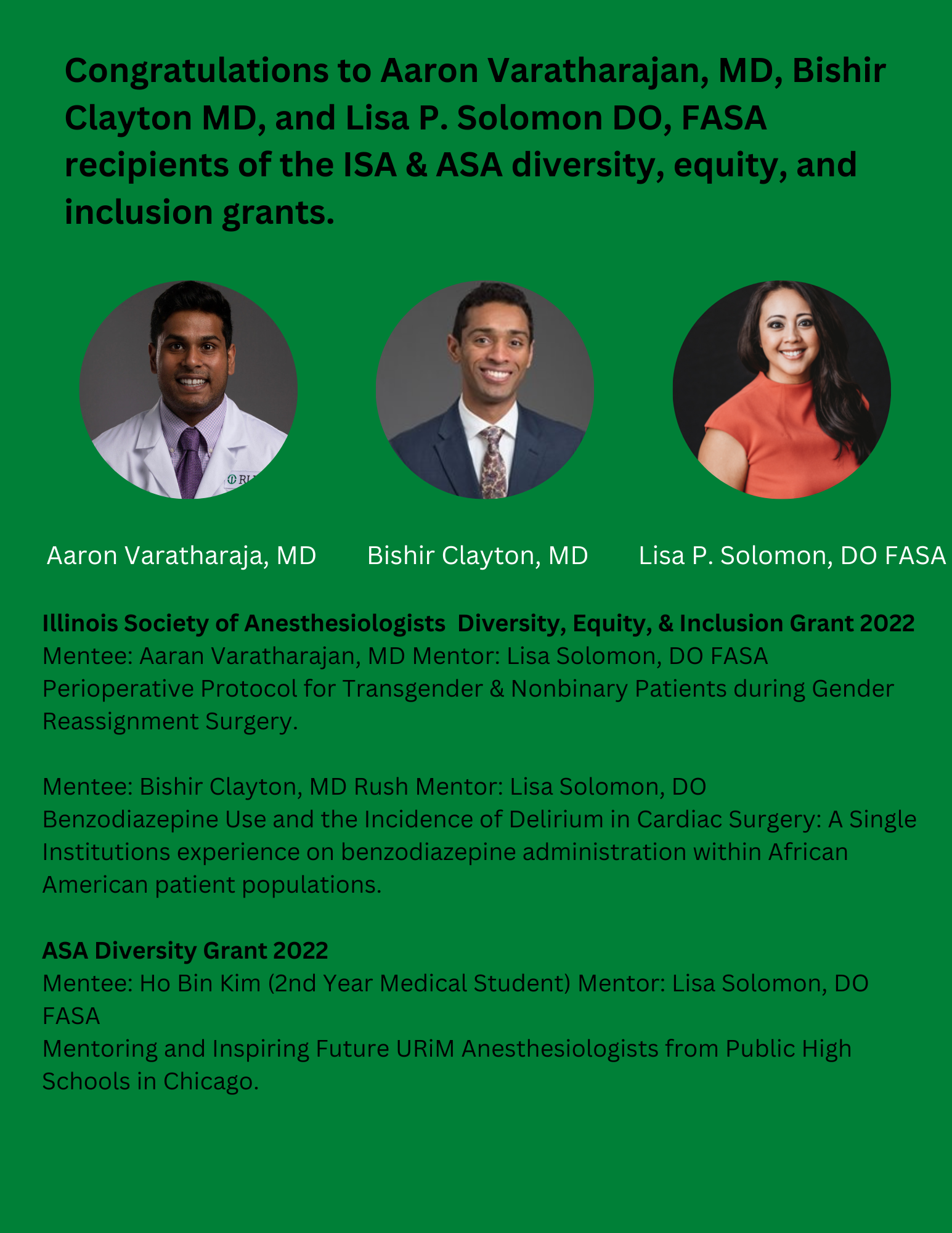 Congratulations to Aaron Varatharajan, MD, Bishir Clayton MD, and Lisa P. Solomon DO, FASA recipients of the ISA and ASA diversity, equity and inclusion grants.