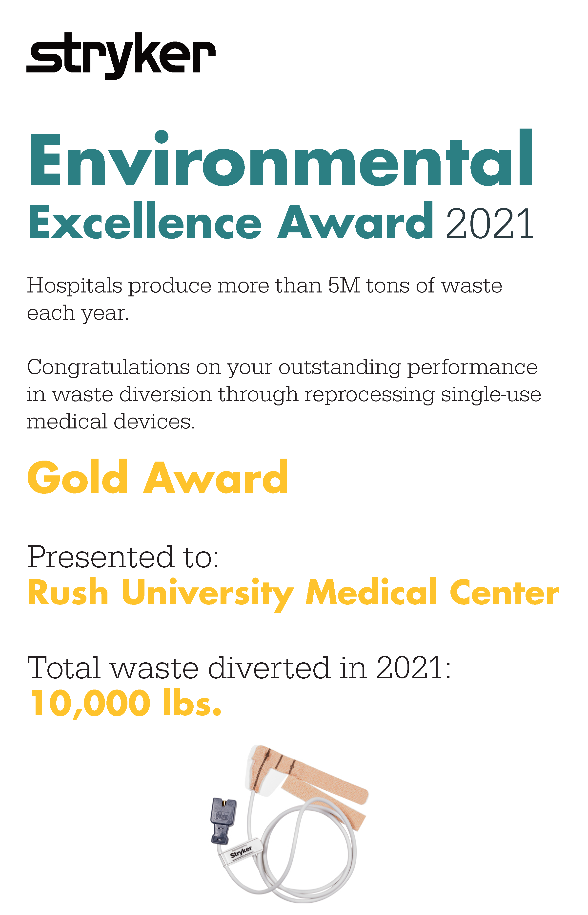Rush University Medical Center was recently awarded a GOLD Award by Stryker Sustainability Solution's team for their efforts to reduce waste. In 2021 Rush diverted 10,000 pounds of waste. We are continuing to work toward more sustainable process, workflows, and operations in the coming years and appreciate the efforts of all the Rush teams.
