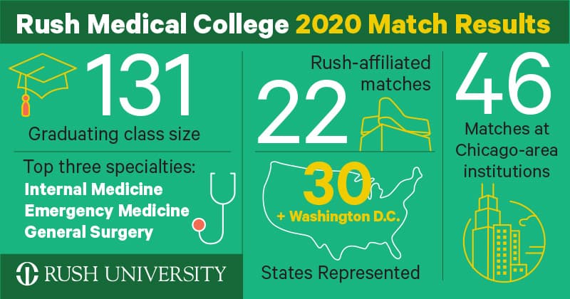 No matter if a student matched in Chicago, Indiana or across the country, they will carry the Rush mission and vision with them. The devotion to service and bettering health outcomes extends far beyond the walls of Rush on the West Side of Chicago and extends into every patient room, operating room or community clinic that a Rush grad calls home.